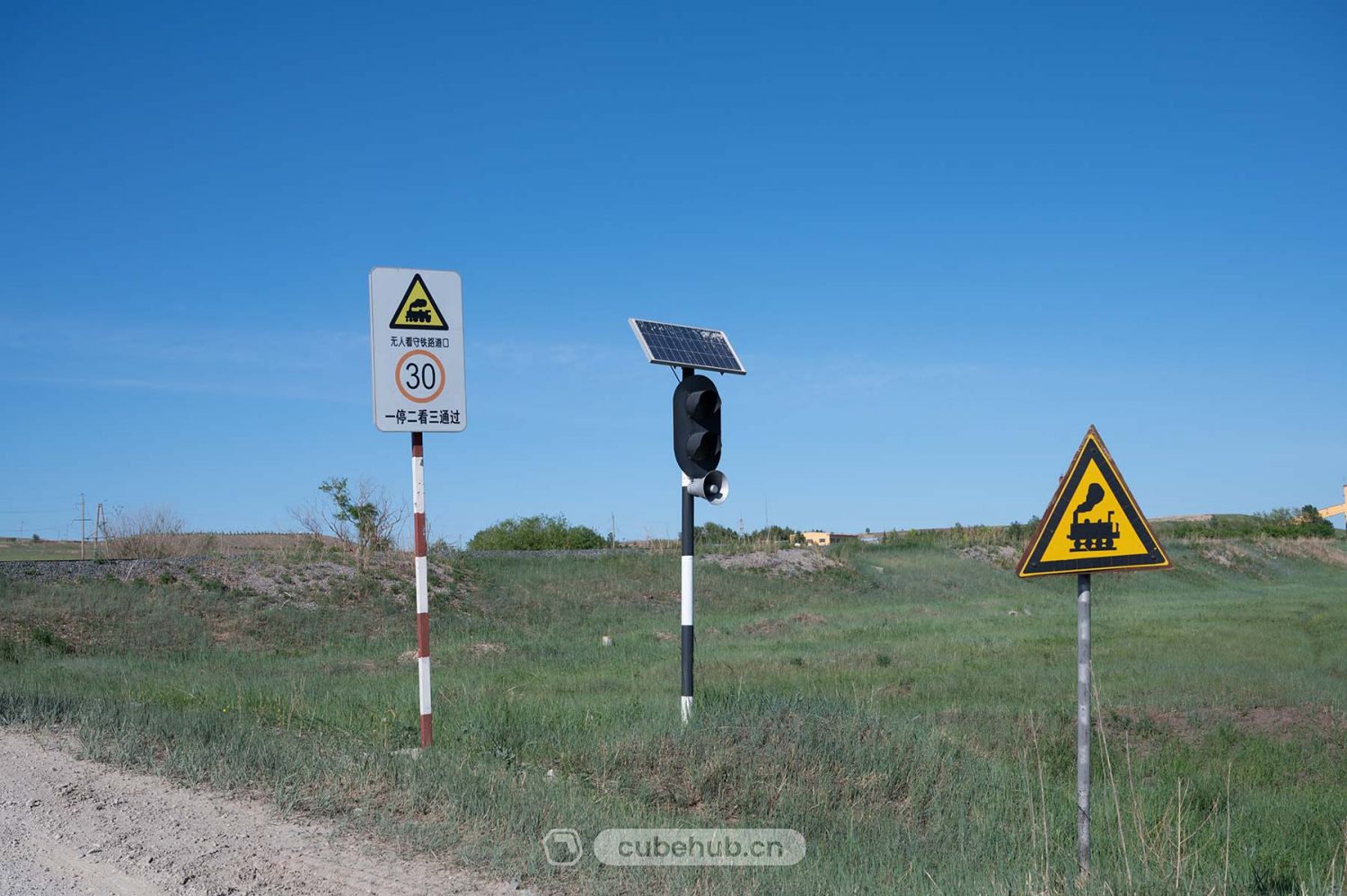 道口还安了一个太阳能信号灯,但是并没有预警作用,通过道口时还是需要注意观察。