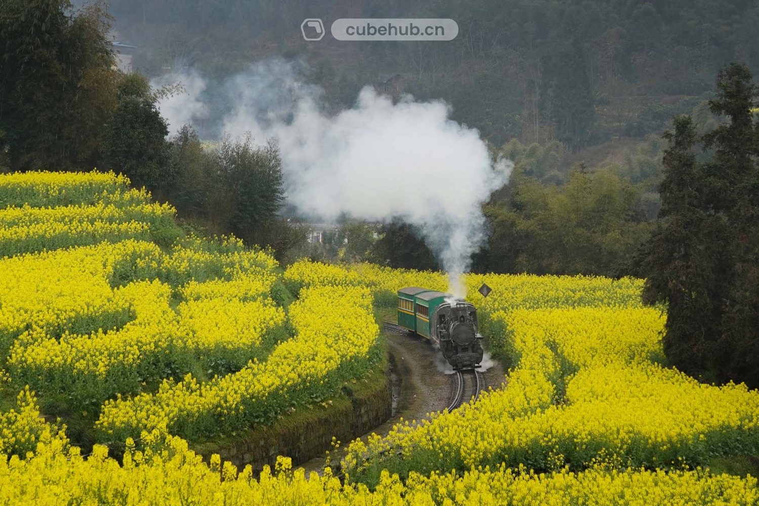 乐山犍为县利用嘉阳煤矿窄轨铁路开行旅游观光列车,保留了真正的c2型蒸汽机车运行。群山秀水间蒸汽机车升腾的烟雾和汽笛声交织,逢春暖花开之际,鲜艳的油菜花盛开,金黄漫山遍野,花香、草腥、晨露和烧煤的气味一同扑鼻而来,小火车浸在油菜花海里美不胜收。