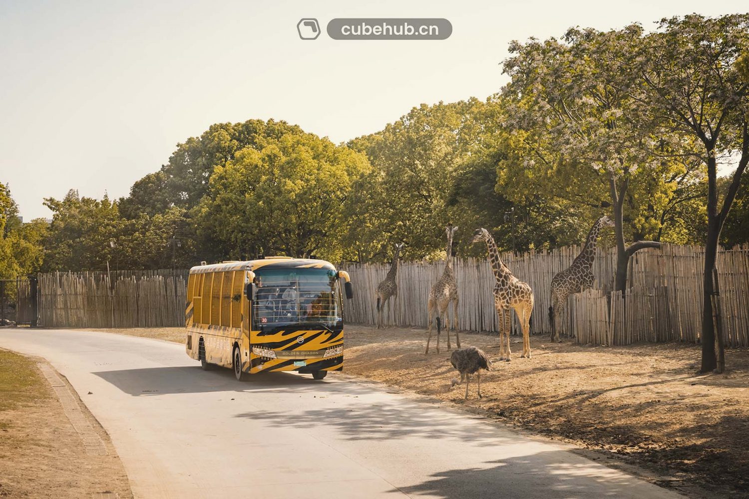 龙威在上第一个坡的时候熄了火,停顿的几十秒间从后方赶上来了一台上海野生动物园二代投喂车,我欣喜若狂,也顾不得什么形象,眼里全是对出好图的渴望,便一转身跪在了座位上.. 那天太阳高照,我们与虎皮金旅投喂车一同走过了上海的非洲草原,长颈鹿与鸵鸟彳亍于车前,对车里投来的食物已然司空见惯提不起兴趣;走过了上海的稀树草原,留下了猎豹,猎豹管理车与金旅的合影;走过了上海的大力熊,白虎,野狼领地,见大力熊在车旁游泳,摄白虎在车旁张口等投喂车投食,影野狼在车旁呼呼大睡。值得一提的是我们的驾驶员速度够慢,积压了四台大巴排排队,*这场景感觉还挺罕见的*,便留下了一组美图。