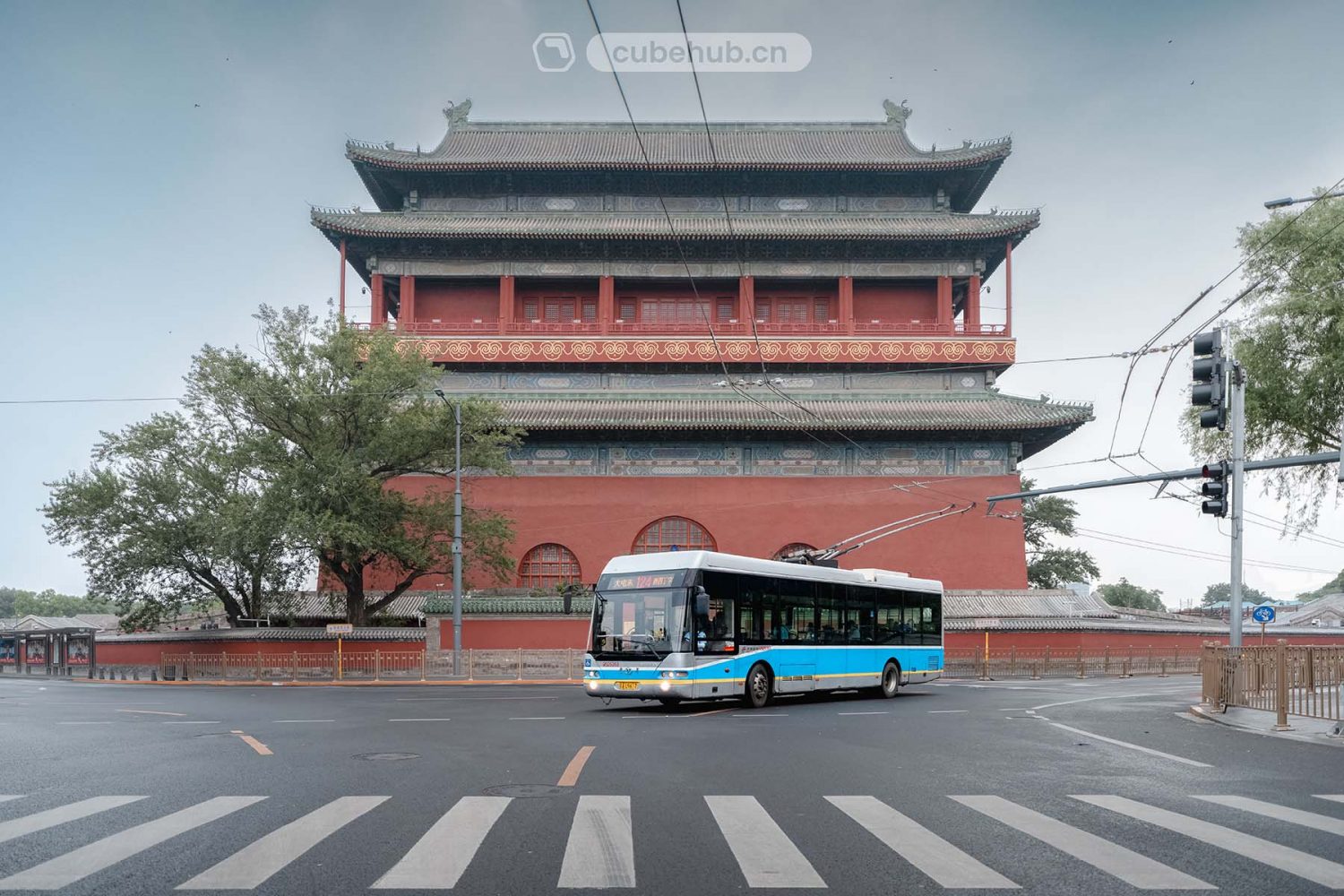 但在去年八月左右,不知道是不是首都文旅部门为了讨好前来打卡的上帝们,鼓楼路口面向正南的红绿灯被挪到了鼓楼南大门的东侧。挪动后的红绿灯在长焦角度下无可避免地会与无轨电车修长的辫子发生干涉,效果远逊从前。